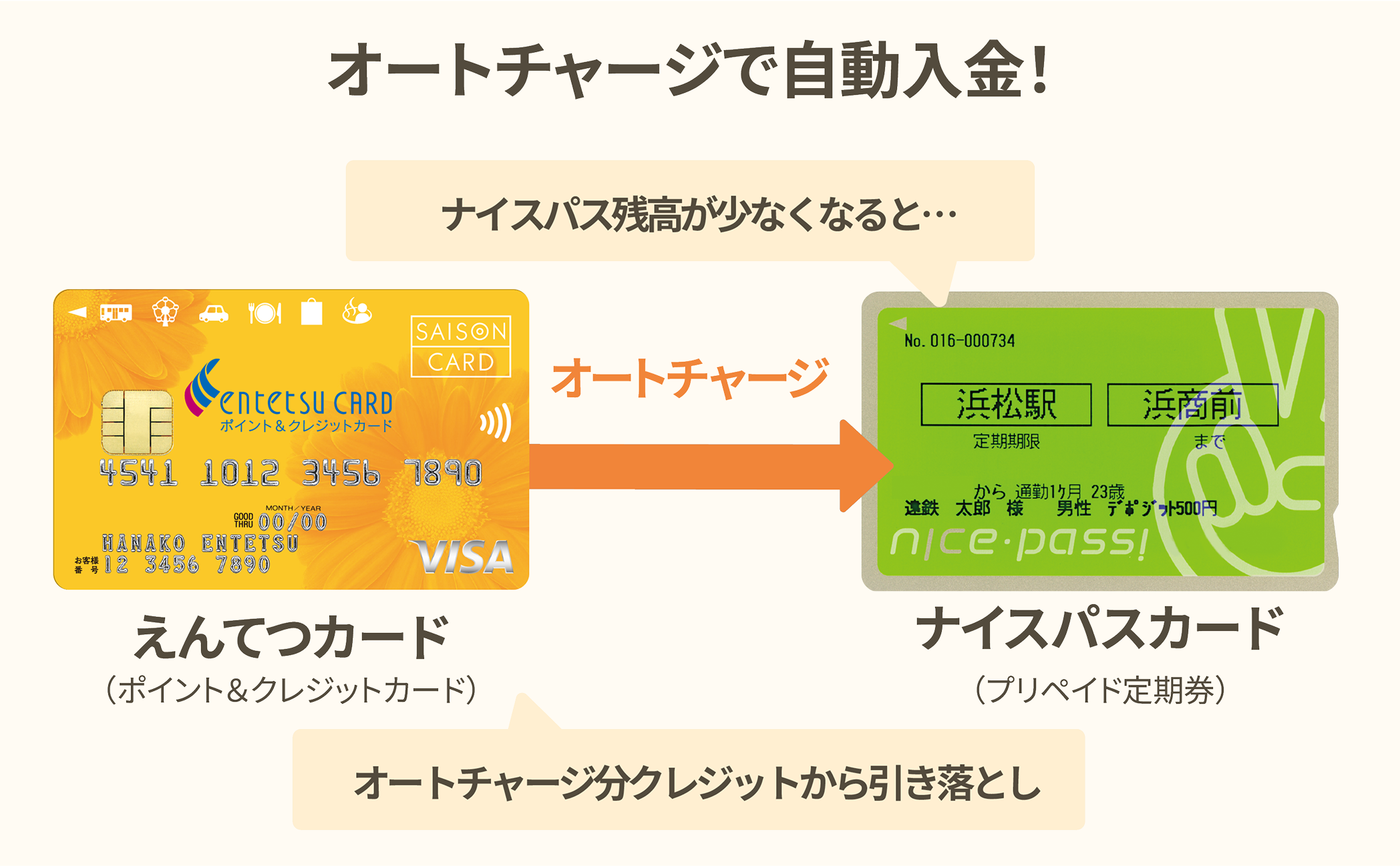 オートチャージ実行判定金額は、オートチャージ実行金額よりも少額、もしくは同額をお選びください。オートチャージ(ナイスパスへの入金)分のお支払いは、えんてつカードお申し込み時にご指定いただいた銀行口座から引き落とされます。